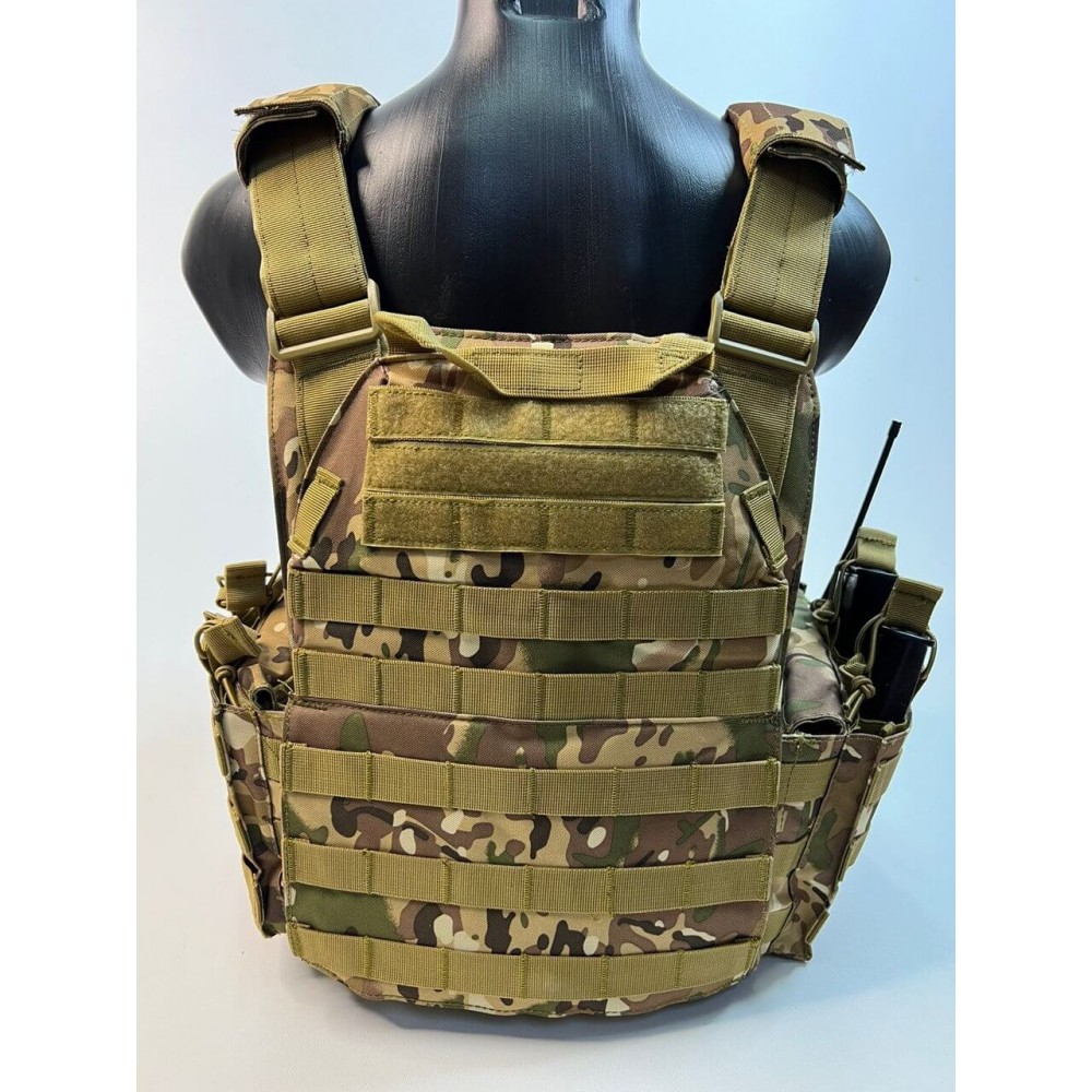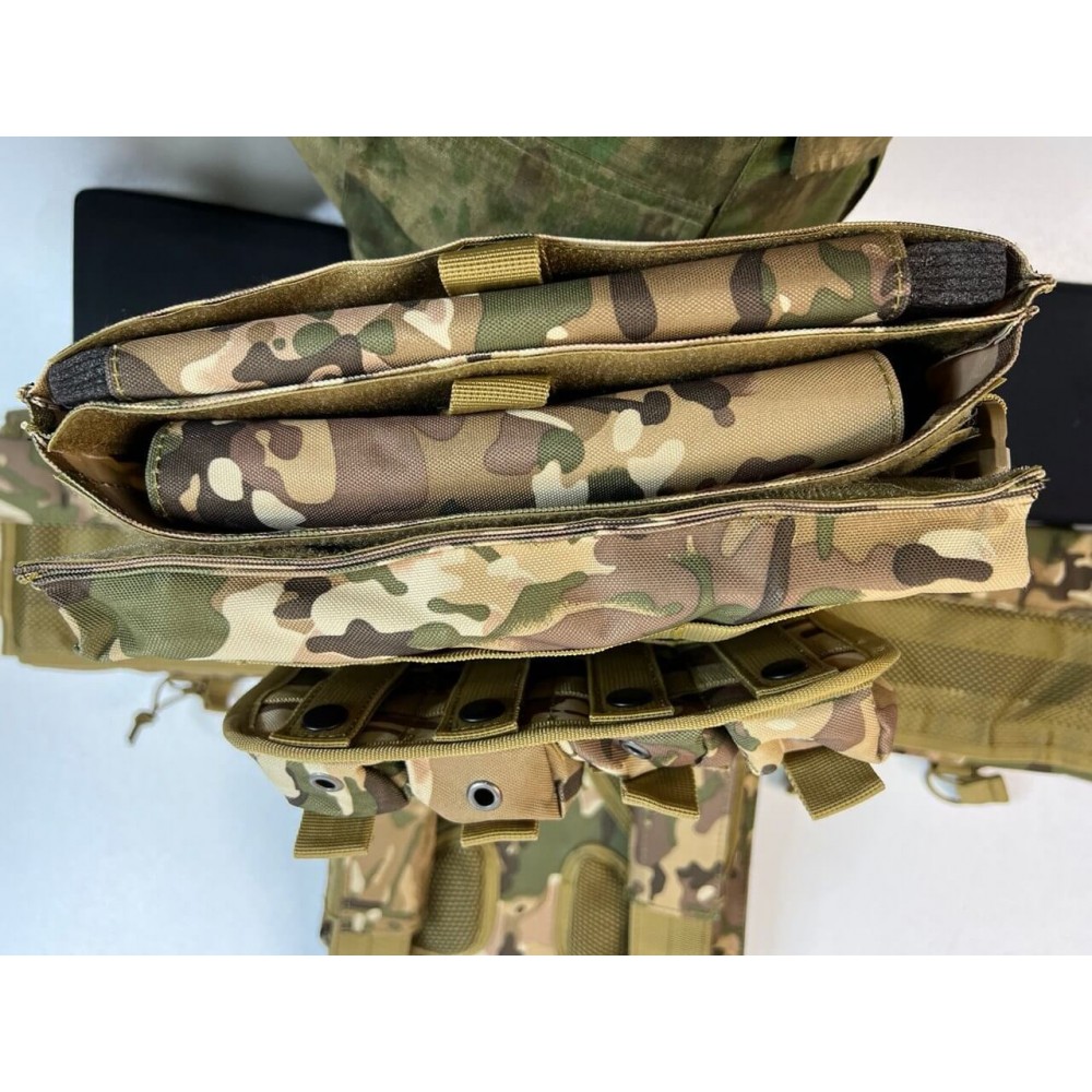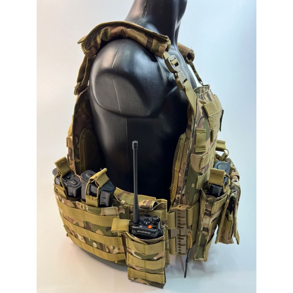 - Множество карманов: Жилет оборудован разнообразными карманами и системами крепления Molle, которые позволяют носить с собой различное тактическое снаряжение, включая магазины, гранаты, фонари, аптечку и другие необходимые предметы.