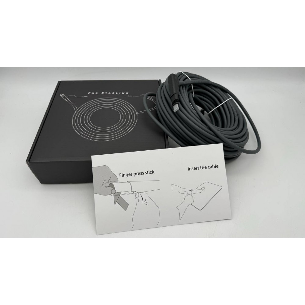 Соединительный кабель Starlink длиной 22,86 метра служит заменой стандартному кабелю в 15 метров, входящему в комплект Starlink, для обеспечения дополнительной дистанции между спутниковой антенной и роутером.
